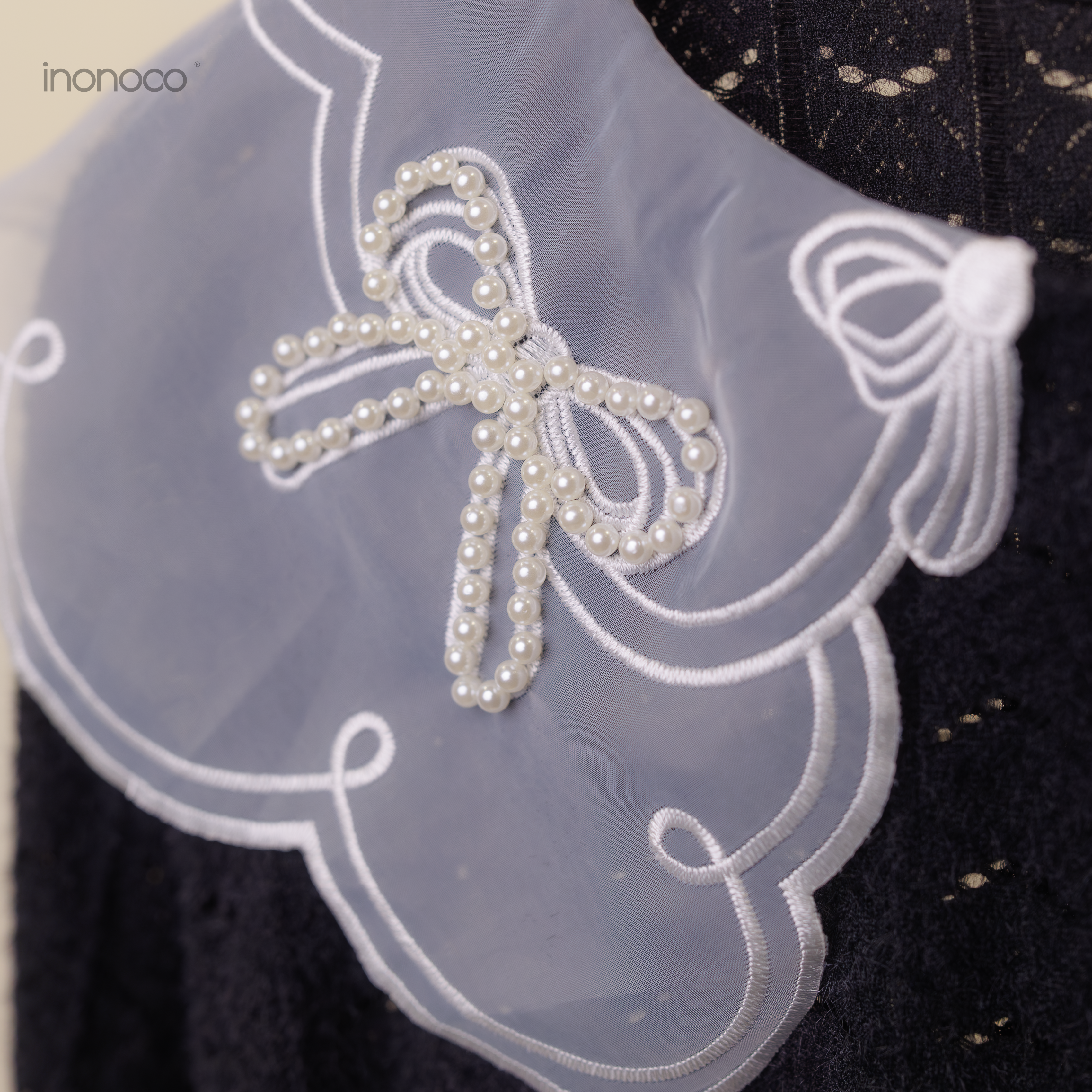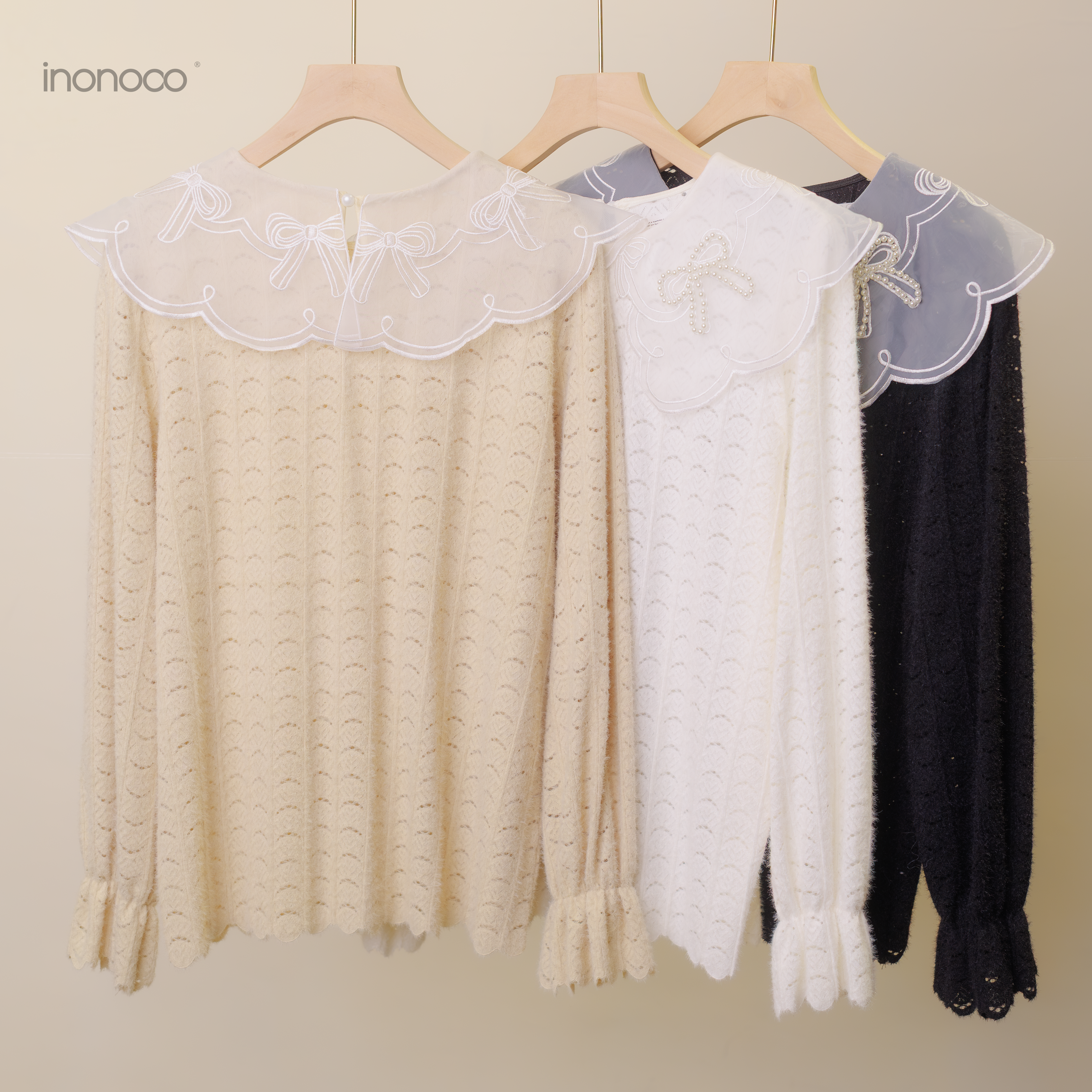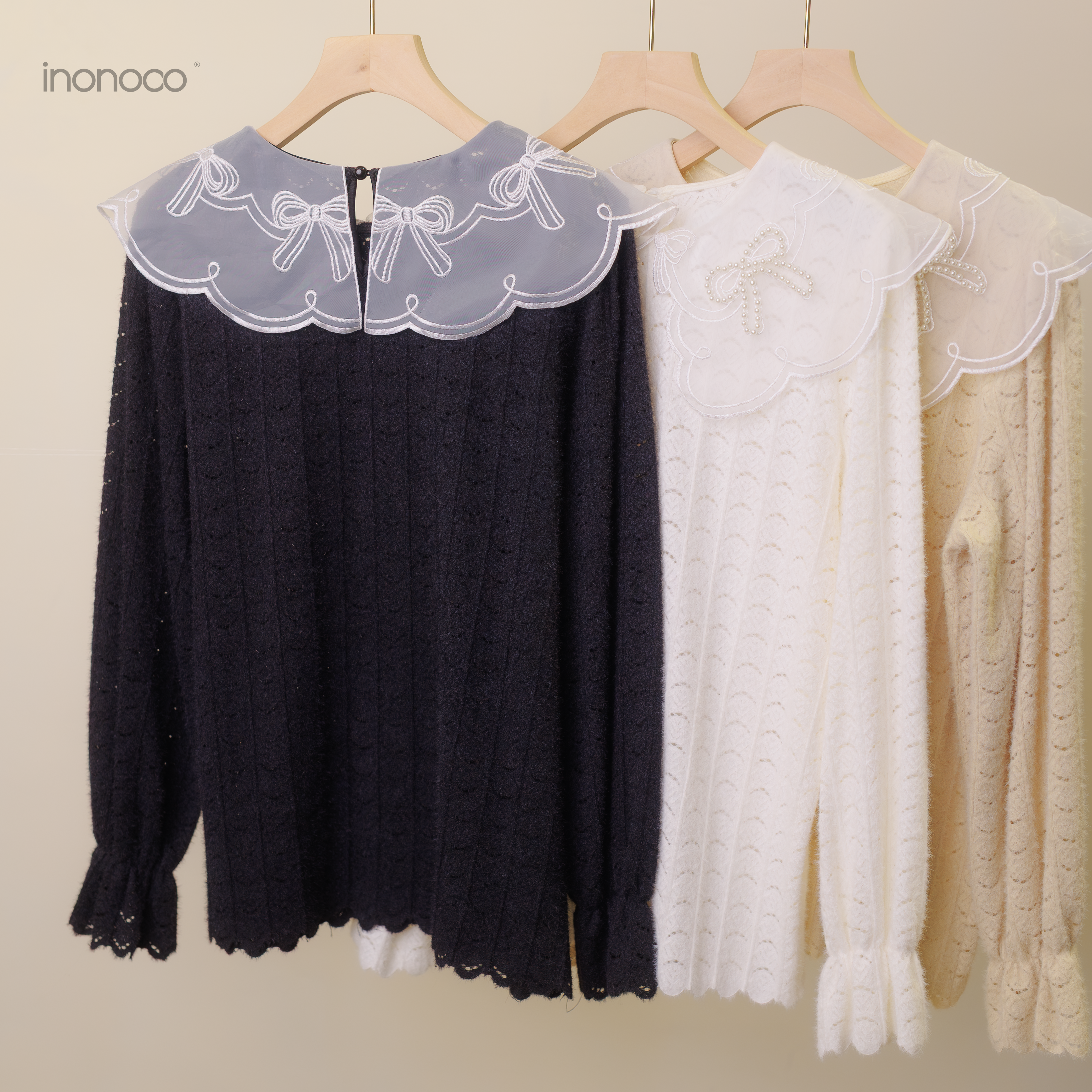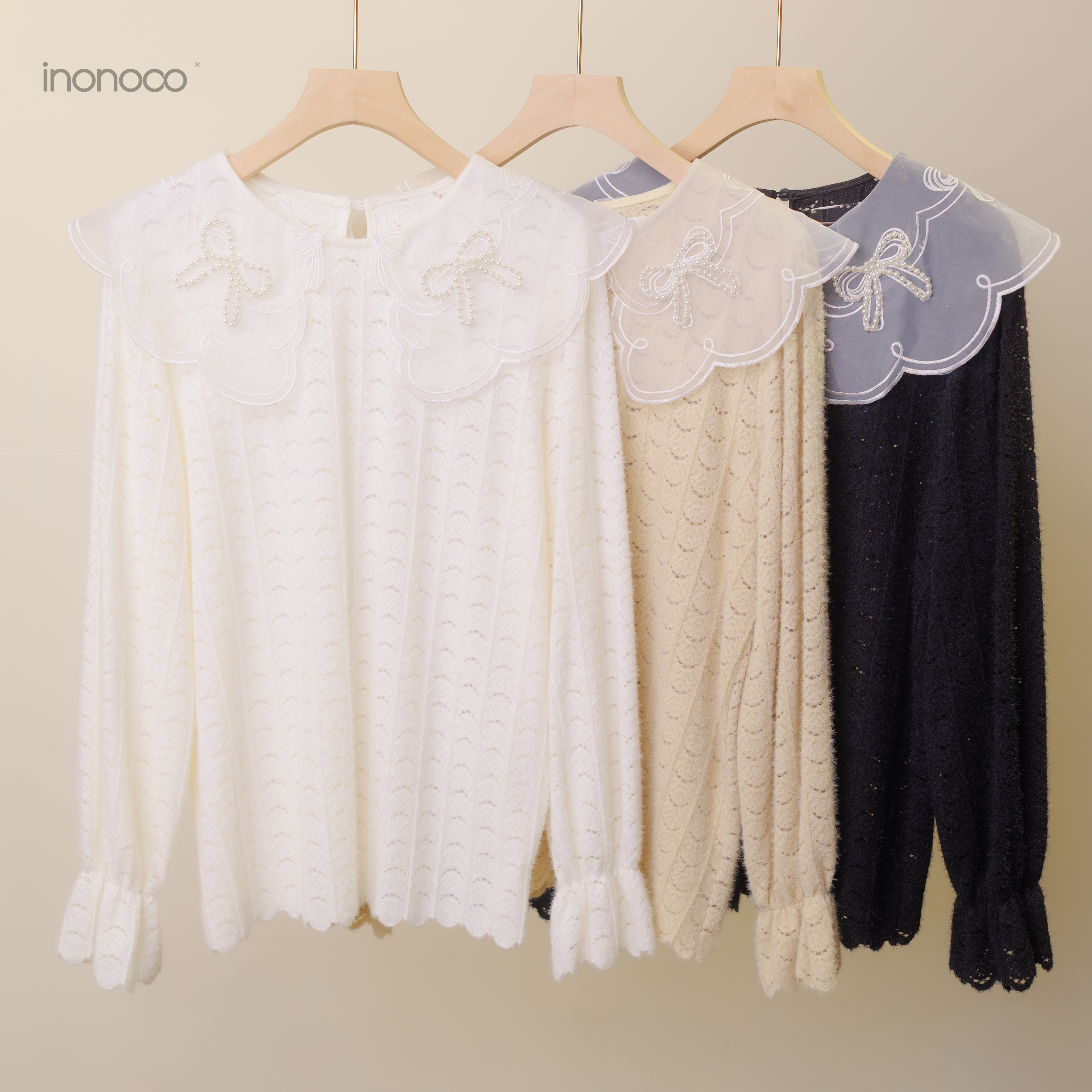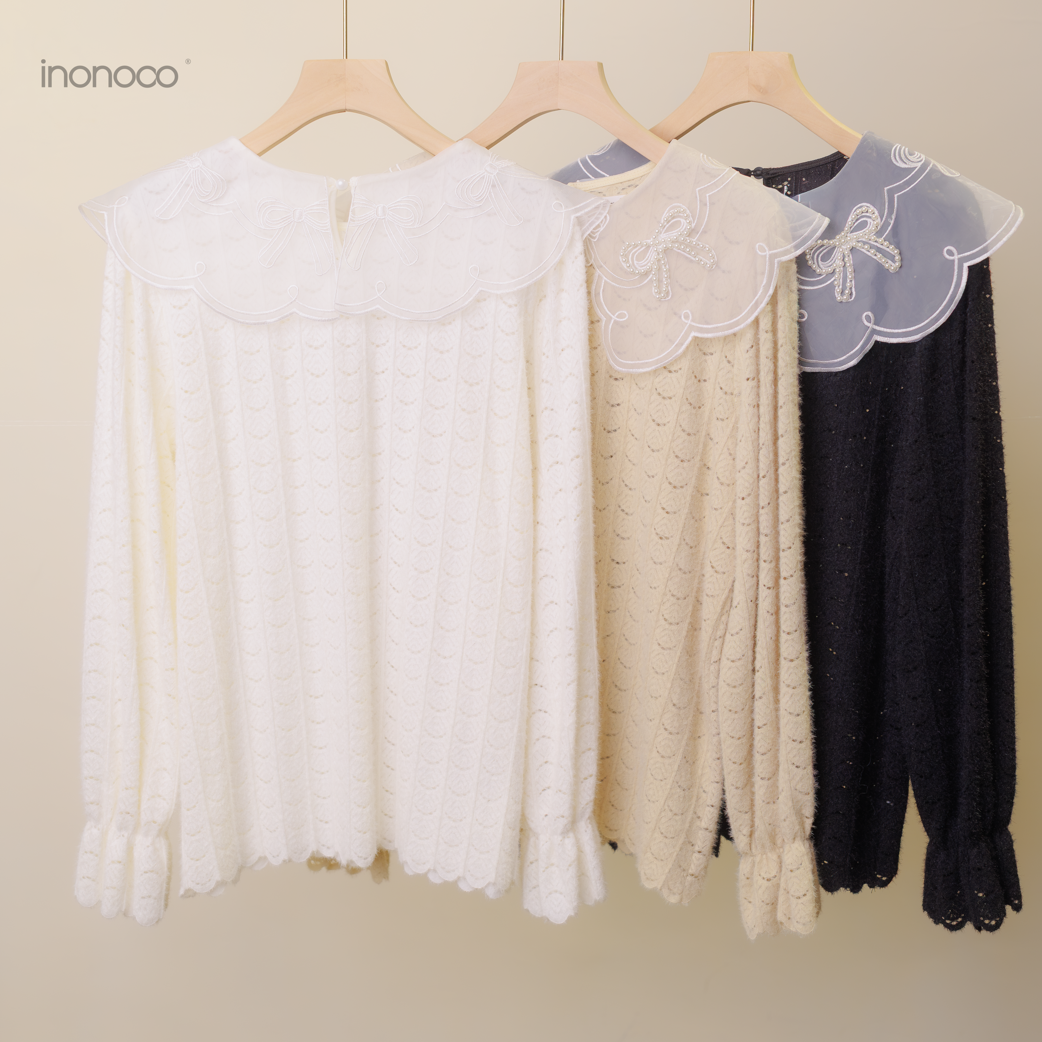 釘珠刺繡領直紋絨面蕾絲上衣 #25925