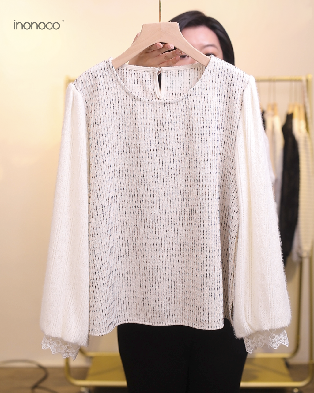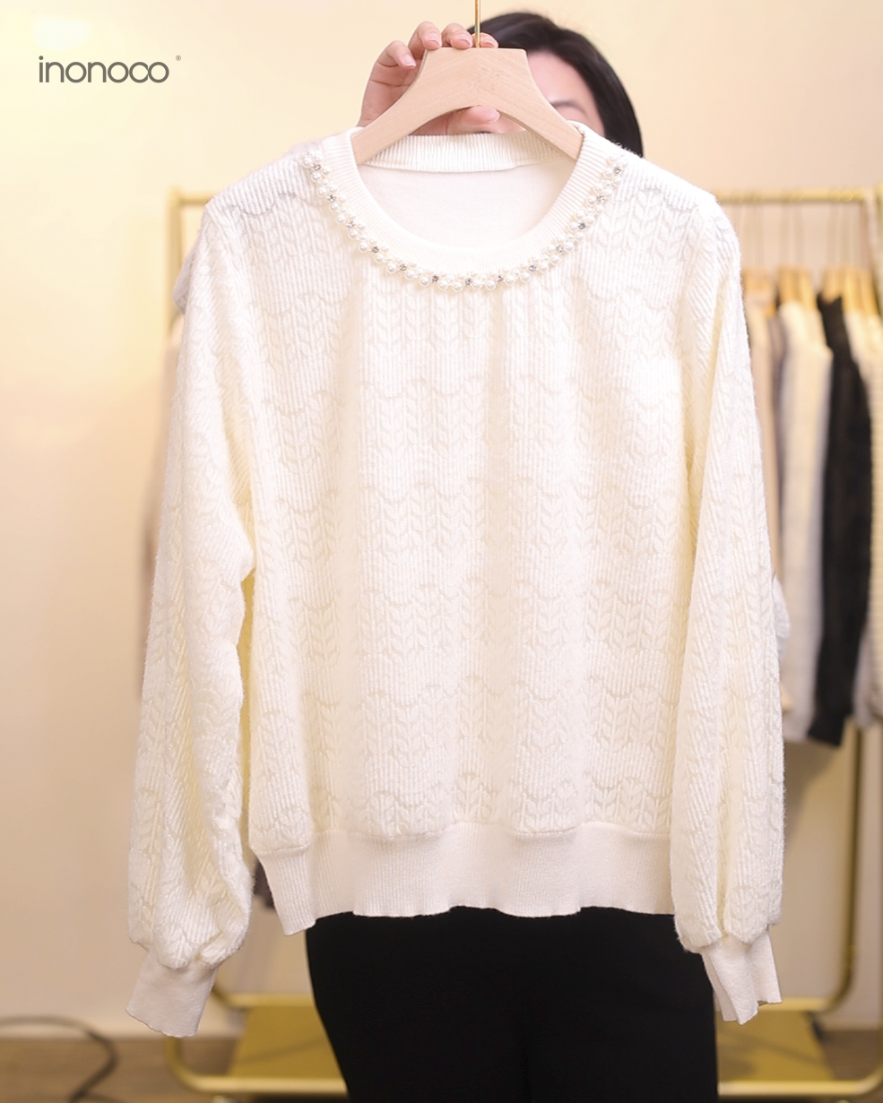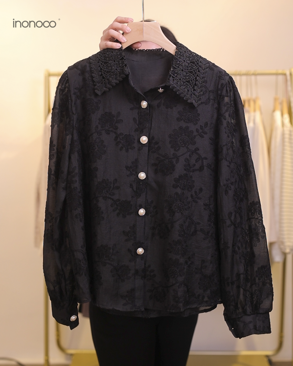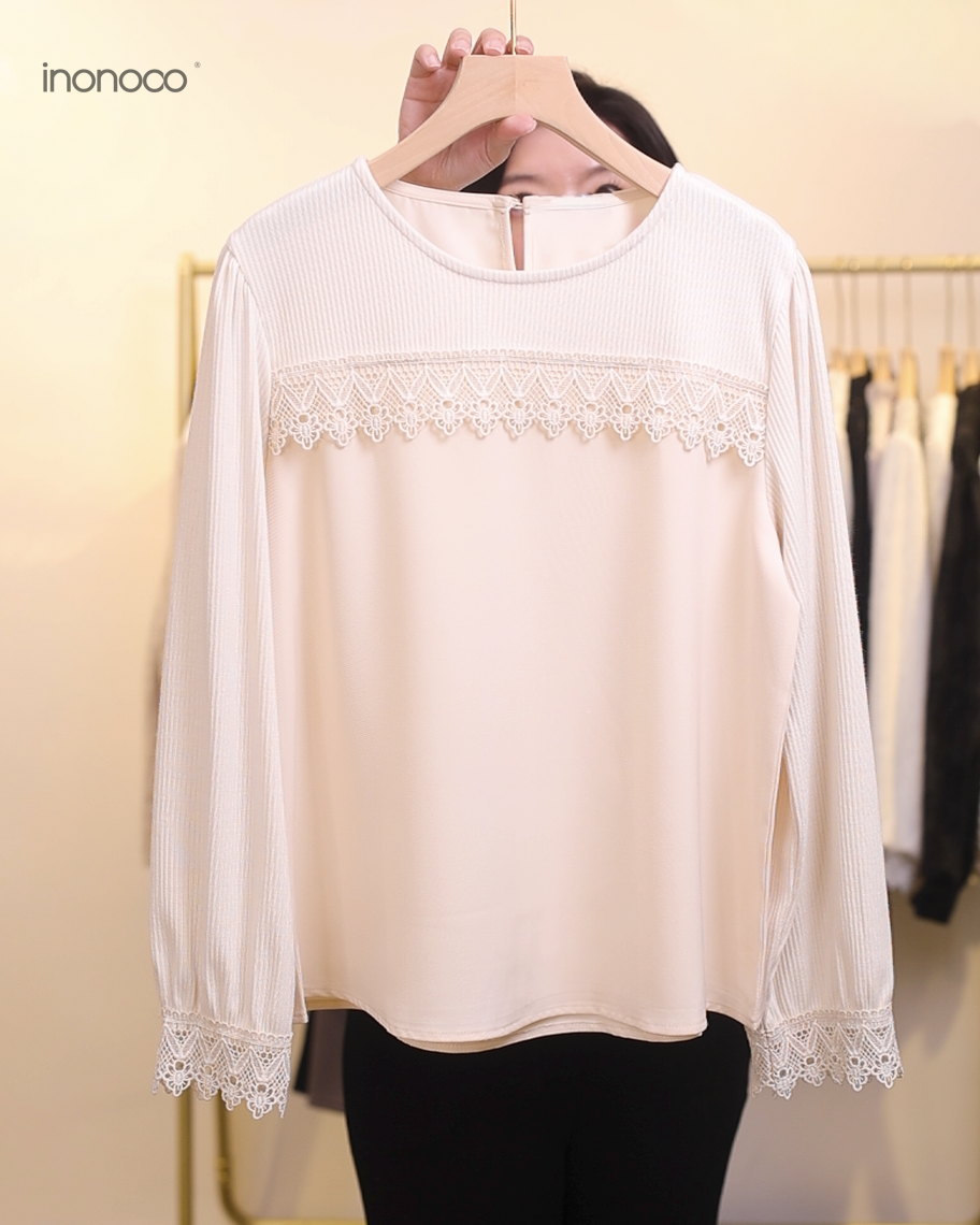 立體釘珠勾花直紋磨毛蕾絲上衣 #25839